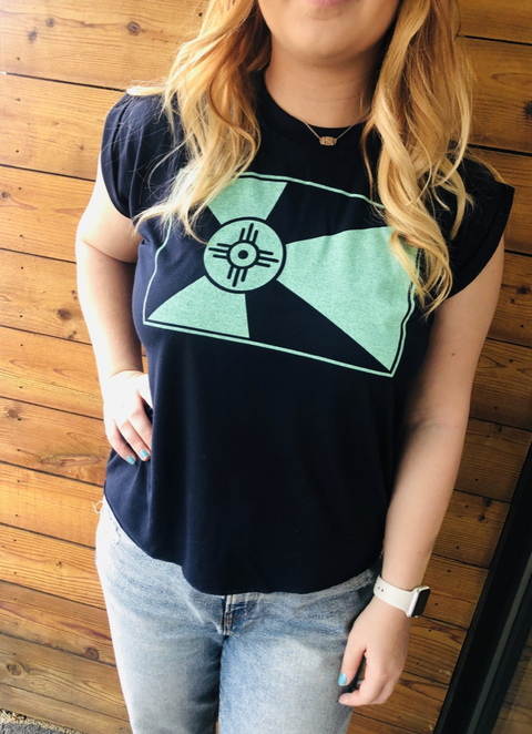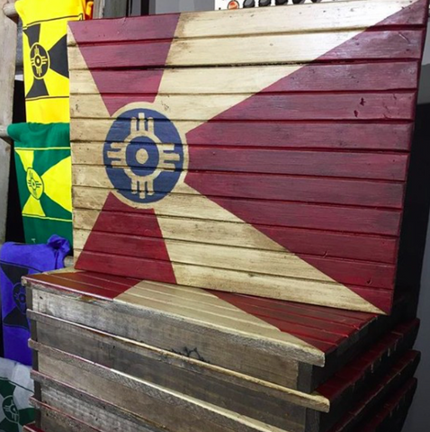 The Wichita flag was officially accepted on Flag Day, June 14, 1937. The Winning design was created by local artist Cecil McAlister, who won a grand total of $40 for his first place design. The flag is made up of 3 distinct components: The "blue sun" is slightly off center and is a symbol of happiness & contentment. The design over the "blue sun" is a Native American symbol for "hogan" or permanent